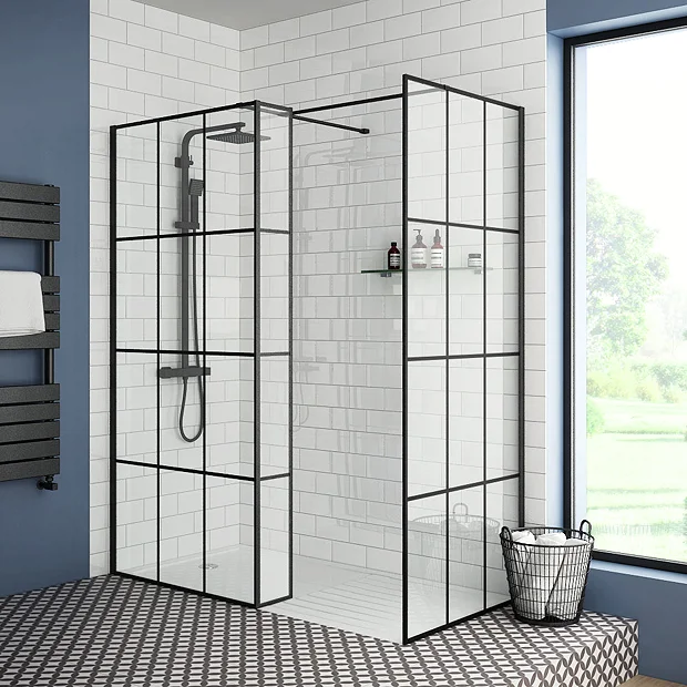 The rectangular Arezzo Matt Black Wetroom Return Screen features a digitally printed grid pattern for added dimension and depth in your bathroom. This particular wetroom return screen is 215mm wide, you can combine it with other screen sizes to create the shower enclosure of your choice. This trendy black frame shower screen is made with 8mm toughened safety glass.
