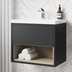 Arezzo Senza 600mm Matt Black / Vicenza Oak Wall Hung Vanity Unit With Open Shelf + Ceramic Basin