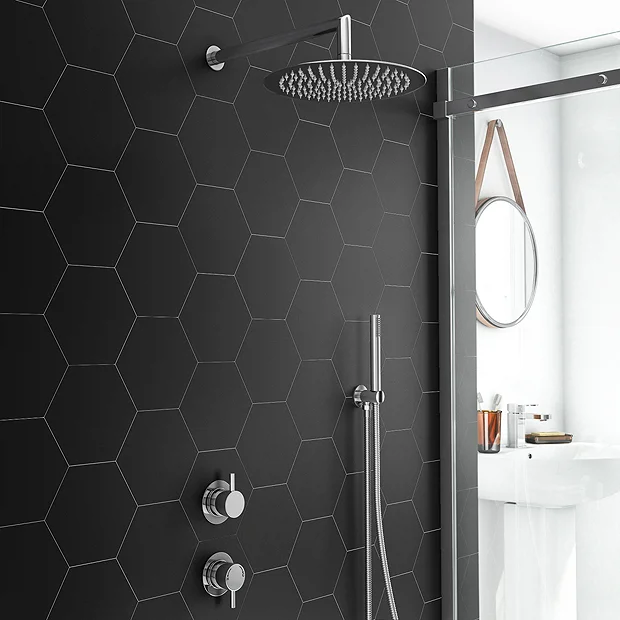 Create your own private oasis with the Cruze Round Thermostatic Control Valve. An indulgent rainfall shower head combines with a futuristic pencil style handset for a versatile showering experience. The concealed shower valve ensures all the fittings and fixtures are hidden, resulting in a clean, minimalist look for your bathroom. Smooth, rounded controls in shiny chrome allow you to find the perfect temperature and flow and switch seamlessly between the two outputs. This hardwearing set is specially designed with fuss free cleaning in mind, so removing limescale is the work of mere moments.